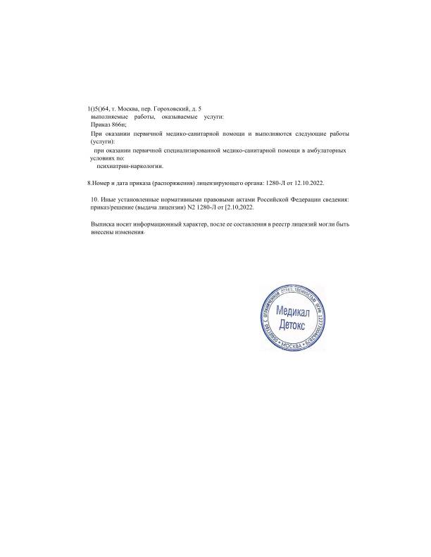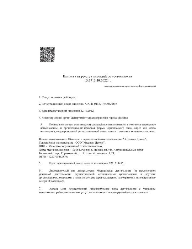 ООО «Медикал Детокс» ЛО41-01137-77/00620856 Москва пер. Гороховский д. 65, ОГРН 1147746027417